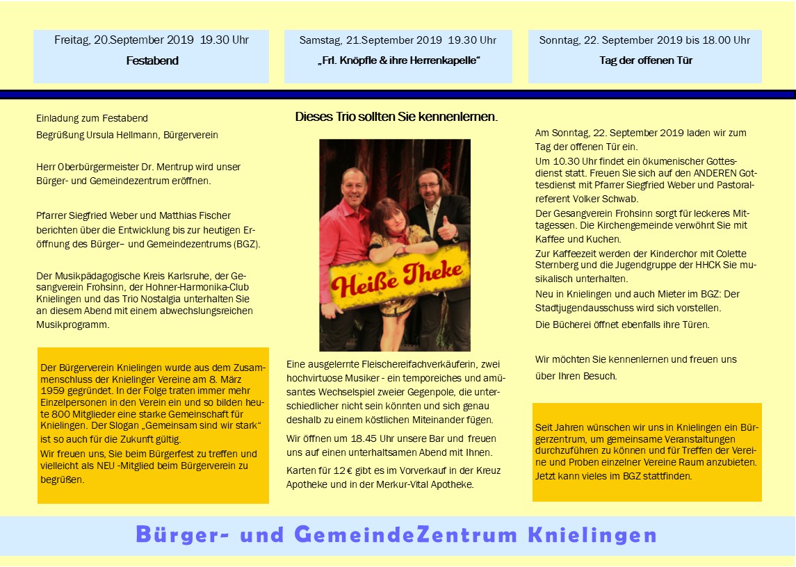 Geschrieben am 07. September 2019. Bürgerfest Feiern Sie mit uns den 60. Geburtstag des Bürgervereins und die erste Veranstaltung im Knielinger Bürger- und Gemeindezentrum. Beim Bürgerfest gibt es verschiedene Möglichkeiten, das BGZ kennen zu lernen. Aufrufe: 1757