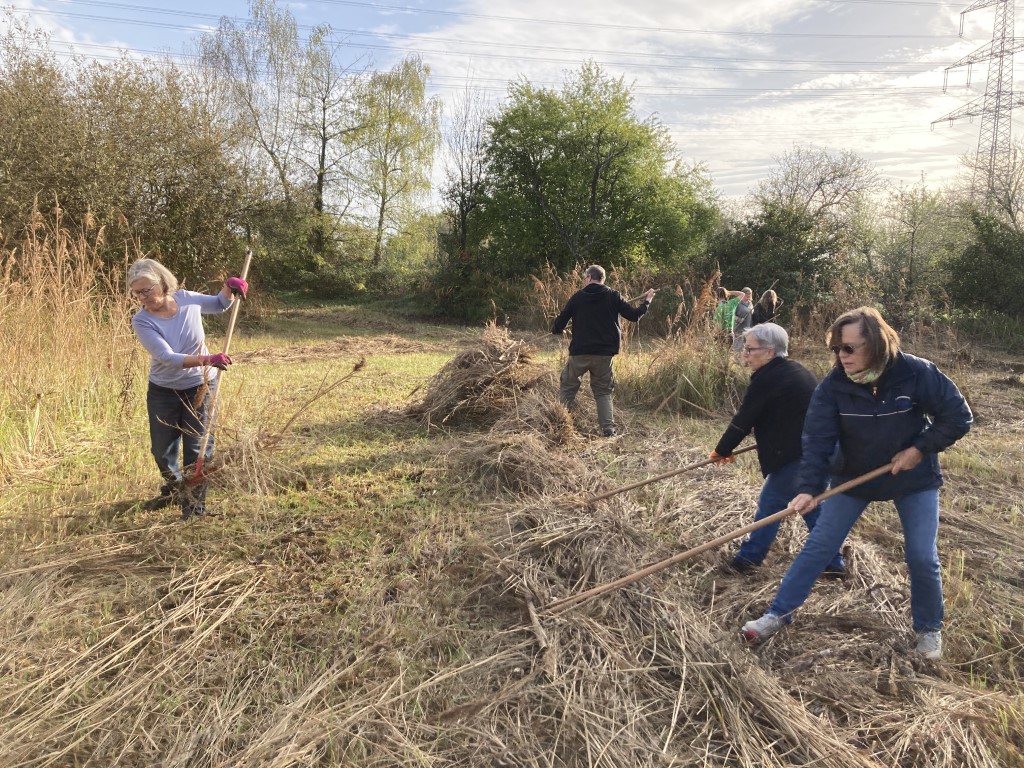 Das Schilf – zusammen mit jungen Grauweiden und anderen – wird nicht nur abgemäht, das Mähgut wird durch die Freiwilligen auch zusammengerecht, sodass es vom Liegenschaftsamt der Stadt Karlsruhe abgeholt werden kann. Ließe man das Mähgut liegen, würde es verrotten und dadurch für einen starken Nährstoffeintrag sorgen. Viele Arten, die auf der Fläche zu Hause sind, benötigen aber einen nährstoffarmen Boden und würden dann schnell verschwinden.