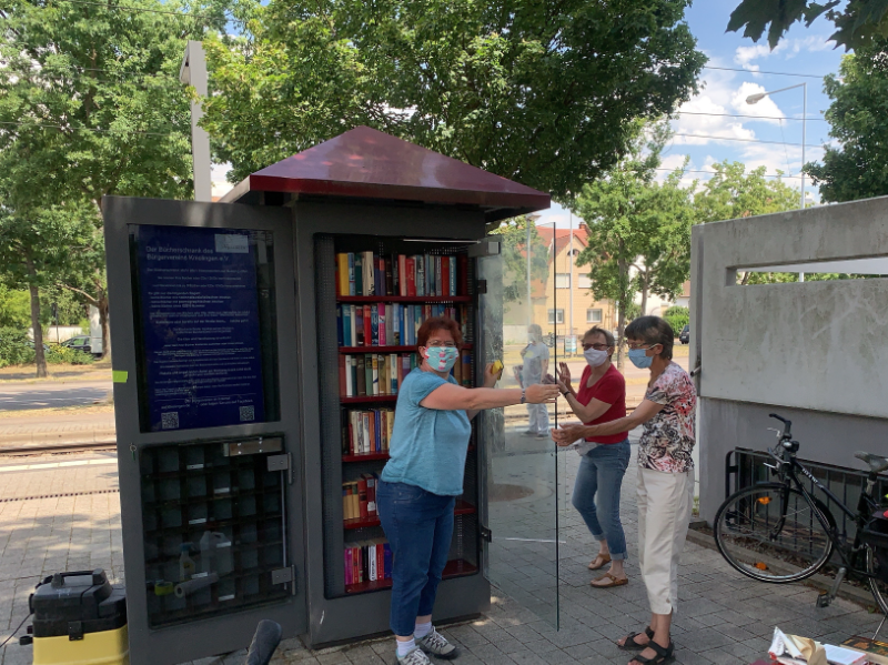 Neben den fleißigen Bücherschrankpaten (von links nach rechts) Heike Tschan, Eva Dannenmayer und Elisabeth Wenzel, ist hier