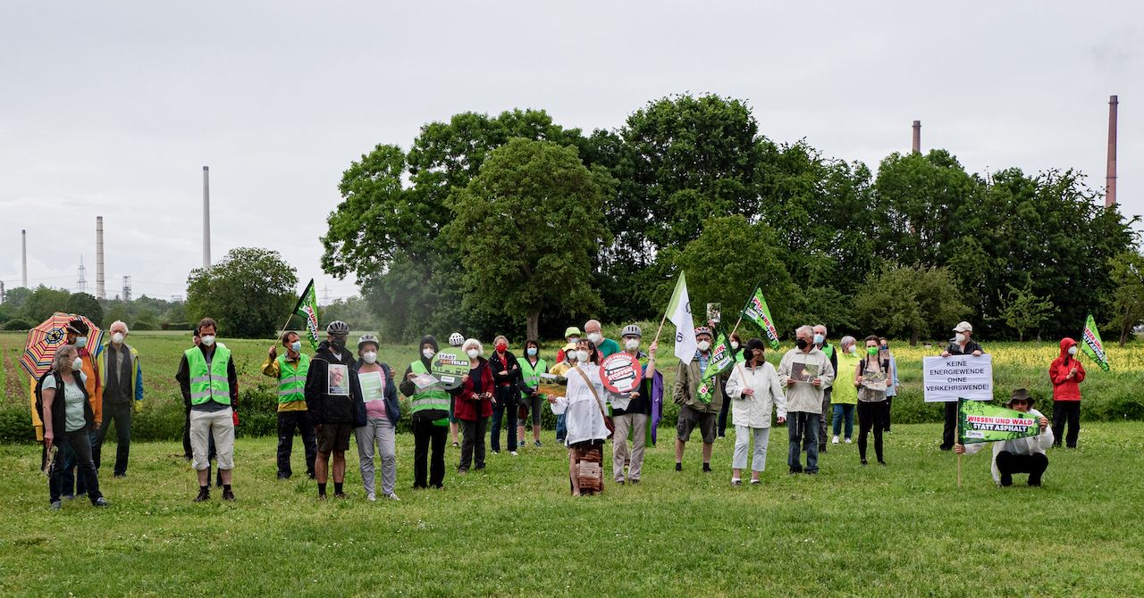 In rund 50 Städten lud das bundesweite Bündnis „Wald statt Asphalt“ am vergangenen Samstag, 5. Juni, zum Protest gegen den Neubau von Fernstraßen und zur Unterstützung einer Mobilitätswende ein. Fast 50 Personen kamen daher am Samstagnachmittag in die Feldflur im Knielinger Norden. Das Bündnis gegen eine zweite Rheinbrücke hatte zu einer Begehung der Trassenvarianten der vierspurigen Querspange von der geplanten zusätzlichen Rheinbrücke zur Bundesstraße 36 aufgerufen. An mehreren Stellen gab es Stopps für Fotos und die Veranstalter informierten über Details zur Planung und über die gefährdeten Arten, insbesondere über Amphibien, Vögel und Insekten.