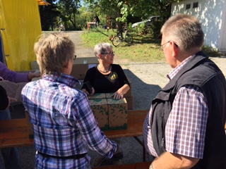 Nahezu unter Einsatz ihres Lebens musste die Organisatorin Ursula Hellmann für das geplante Apfelernte Fest noch Apfelsaft retten. Am Ende war (bis auf die minikleine Reserve) alles verkauft. Das gab es in der Geschichte des Saftpressens ins Knielingen noch nie.